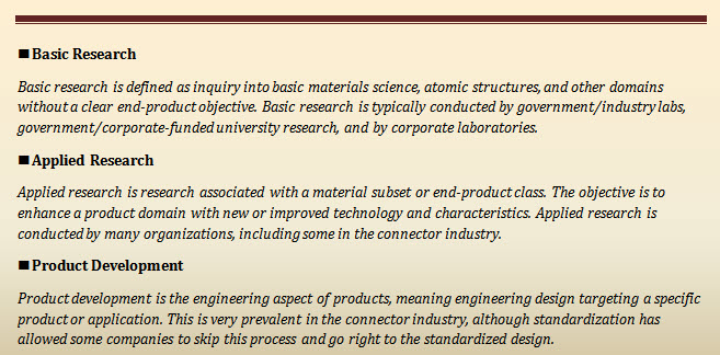 For most companies in the electronic connector industry, R&D means almost any exploratory engineering activity not directly associated with commercial product. It encompasses enabling technologies that improve, enhance, and occasionally create breakthroughs in new product development. But for the most part, connector research is tied into OEM product needs, since connectors are a component part of evolving end-product developments. For the electronics industry at large, it may be helpful to look at the big picture, represented in the chart below: